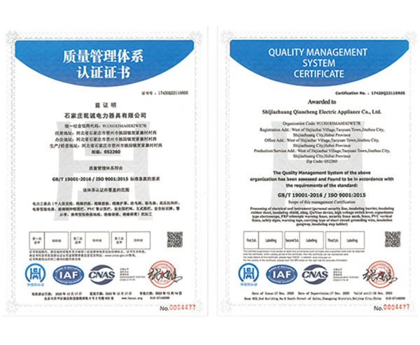 石家庄乾诚电力器具有限公司位于“中国鸭梨第一乡”的晋州市,环境优美,四季水果飘香,公司西距省会石家庄50公里,北距首都北京300公里,铁路连通京广、京九,石黄高速横贯市境,307国道横穿市区,地理位置优越,交通便利。 公司是主要研发、生产、销售电力安全工器具、线路金具、施工工具的专业厂家。拥有雄厚的技术力量,先进的生产设备,健全的检测仪器及工作流程。通过ISO9001:2016国际质量管理体系认证,电力安全工器具、线路金具、线路标识牌分别经电力部苏州电力安全工器具检验中心、武汉高压研究所检验合格,并获得国家质量技术监督局颁发的《工业生产许可证》和省、市级多项荣誉证书,公司严把产品质量关,并以优质的售后服务做保证,让每一位客户放心使用乾...